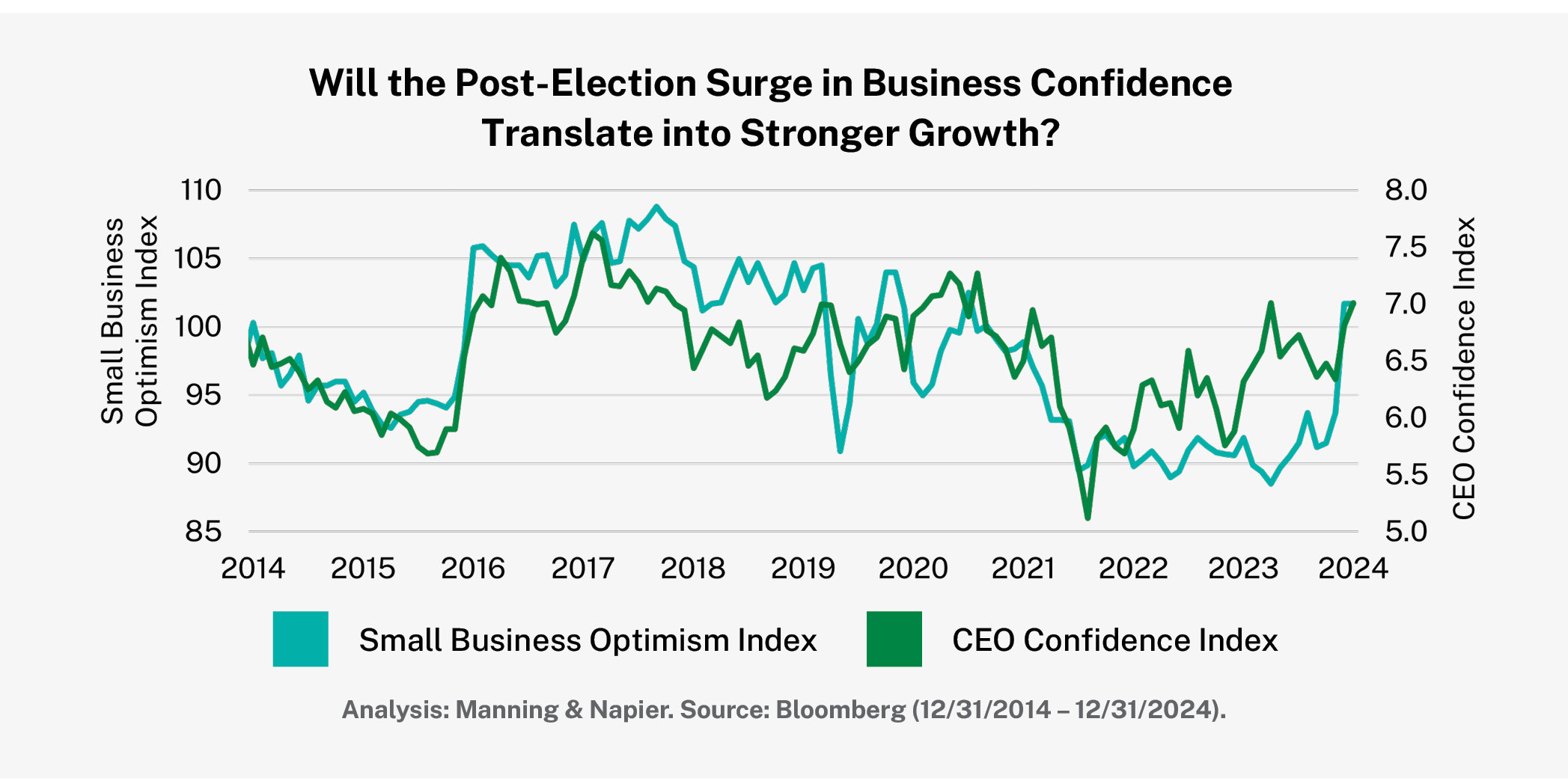 Resiliency is perhaps the best description of the US economy in 2024. Economic growth continued at a respectable pace despite notable weakness in manufacturing, some signs of consumer stress, and a fast-changing interest rate environment. As we move into 2025, the key question is if the economy can shift into a higher gear to drive consumption and earnings growth in the quarters ahead.