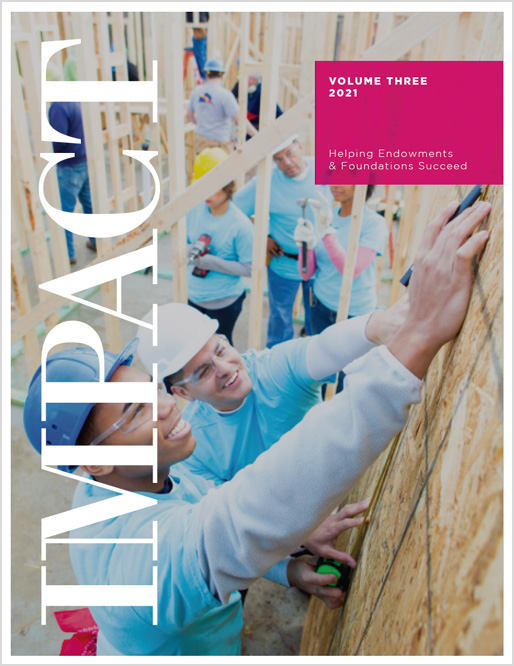 Non-profits, endowments, and foundations face many unique challenges, and never has it been more evident than this year. Organizations like yours are vital to helping our communities thrive, and we created this issue of Impact because we want to help you navigate this unique and ever-changing environment. This edition contains information on investing, fundraising, how to find and retain the right board and staff, and more.