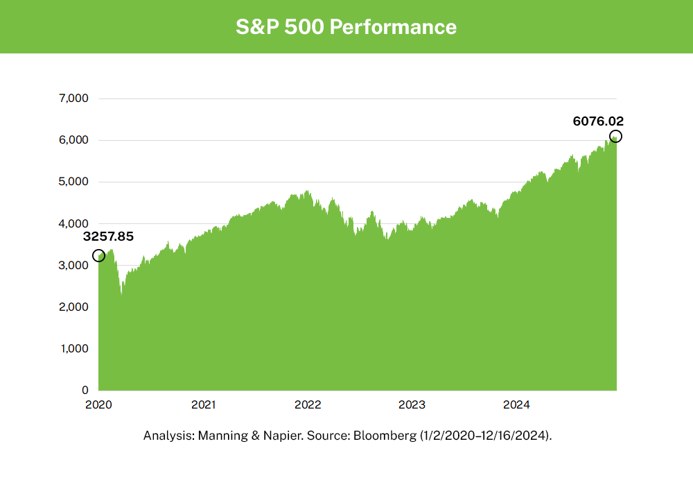 The S&P 500 Price Return Index is an unmanaged, capitalization-weighted measure comprised of 500 leading U.S. companies to gauge U.S. large cap equities. The Index returns do not reflect any fees, expenses, or adjust for cash dividends. Index returns provided by Bloomberg. Index data referenced herein is the property of S&P Dow Jones Indices LLC, a division of S&P Global Inc., its affiliates ("S&P") and/or its third party suppliers and has been licensed for use by Manning & Napier. S&P and its third party suppliers accept no liability in connection with its use. Data provided is not a representation or warranty, express or implied, as to the ability of any index to accurately represent the asset class or market sector that it purports to represent and none of these parties shall have any liability for any errors, omissions, or interruptions of any index or the data included therein. For additional disclosure information, please see: https://go.manning-napier.com/benchmark-provisions.