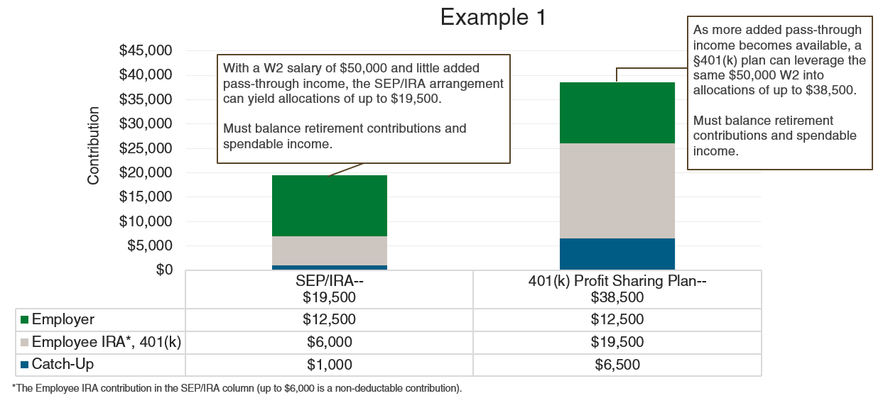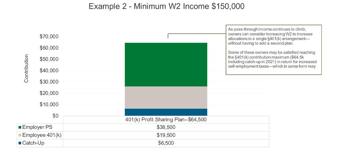 Owners with more substantial pass-through income, sufficient historical average of non-dividend earned income, have more flexibility to build retirement savings. As illustrated in the previous example, a 401(k) Profit Sharing plan can create allocations of up to $38,500 (based on $50,000 W2 income). Owners can increase W2 income (up to $150,000) to increase plan allocations to as much as $64,500 (in 2021).