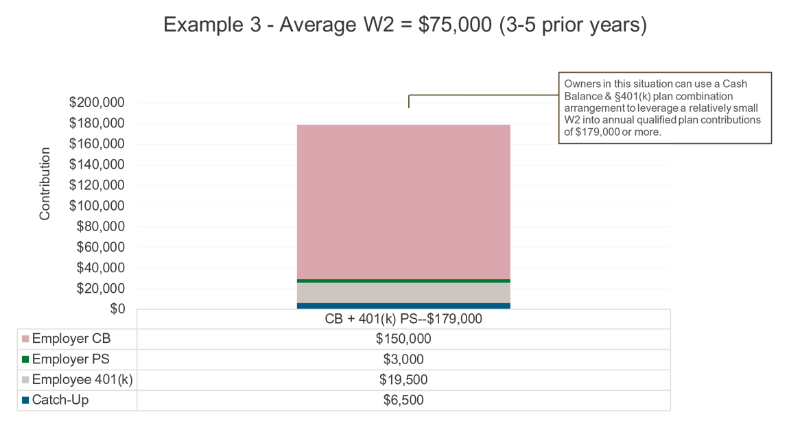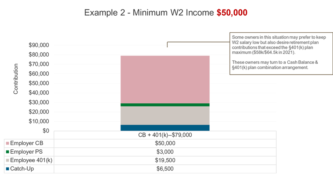 If the owner would rather not increase W2 income, a Cash Balance & 401(k) Plan combination can be easily customized to meet the desired annual contribution amount.