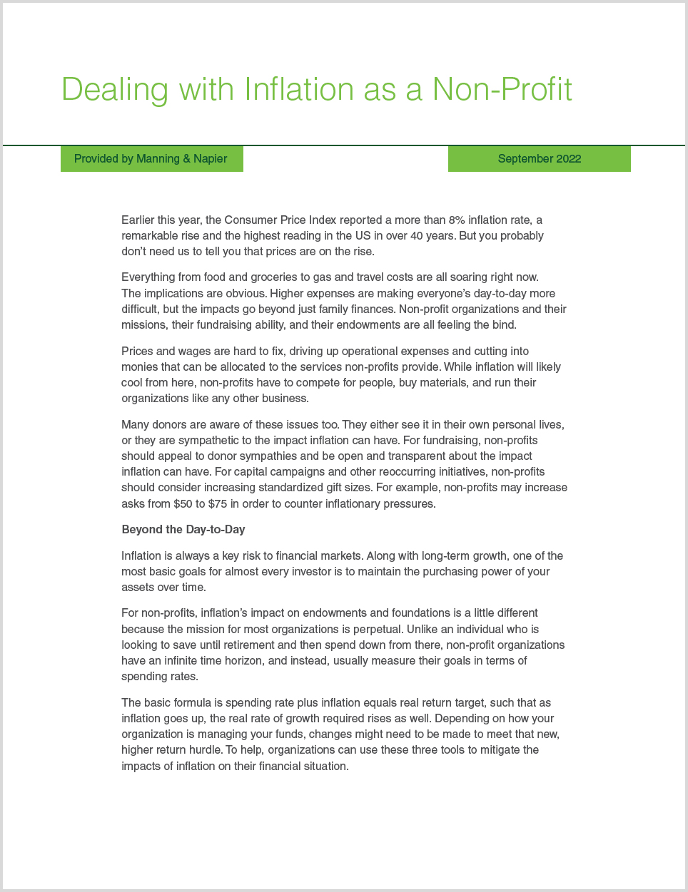 Download this resource to learn more about how non-profits should approach inflation, and feel free to share it with your non-profit clients and prospects.